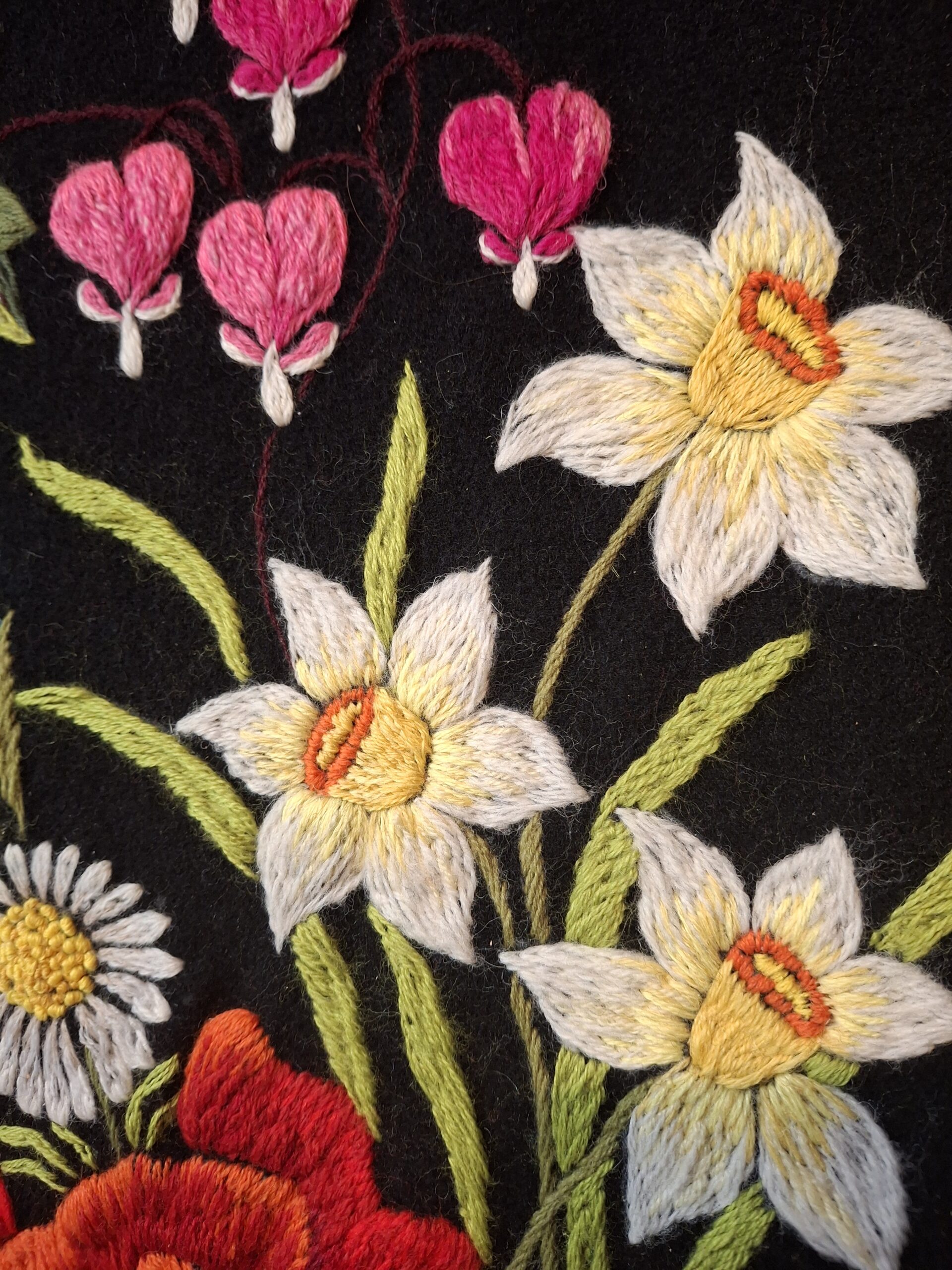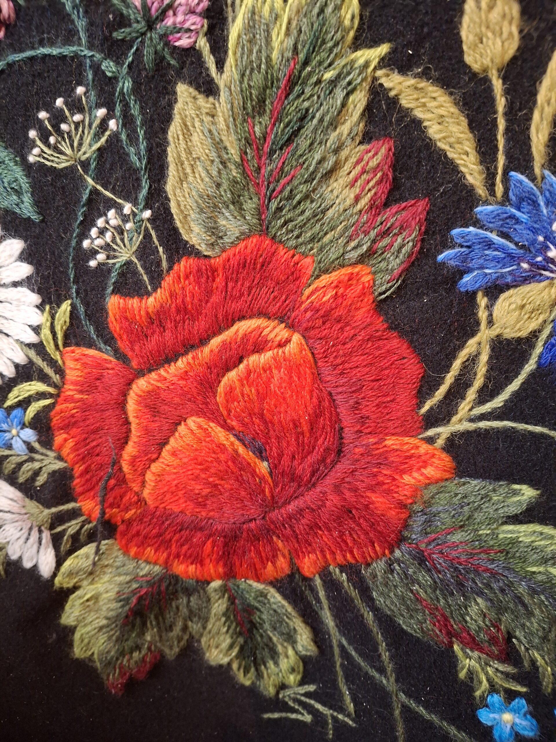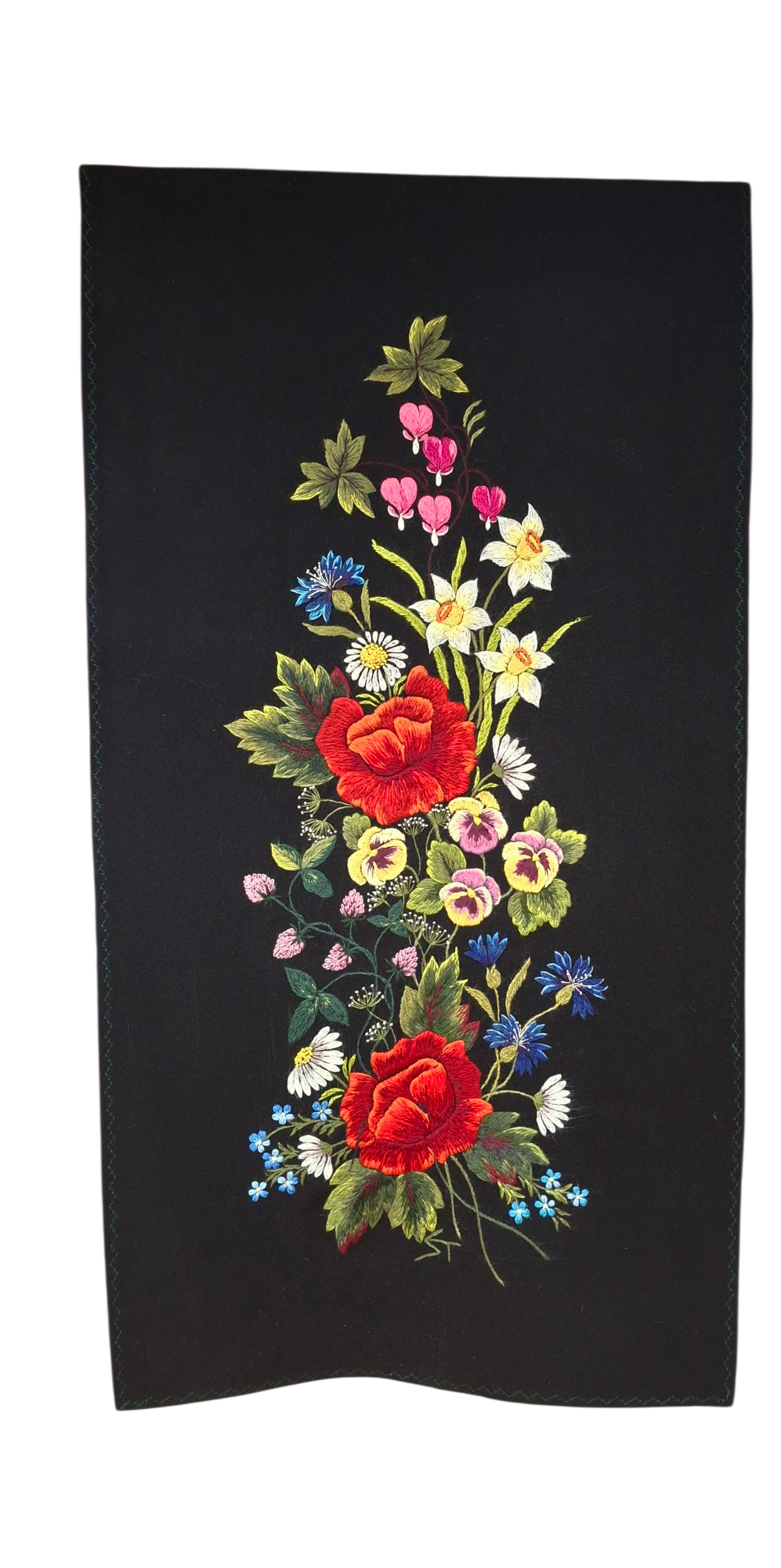 Käsitööna tikitud lillemustris seinavaip. Tikand villasel kangal. Ülaservas riputamiseks kanal ümarliistu jaoks. Liist ei tule vaibaga kaasa, ei mahu pikkuse poolest pakiautomaati.
